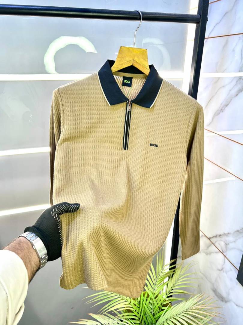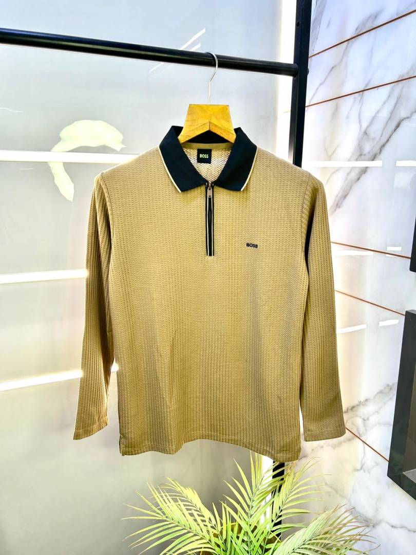 Boss Knitted Full Sleeves Premium Collar Khakhi T-shirt F3111-KH