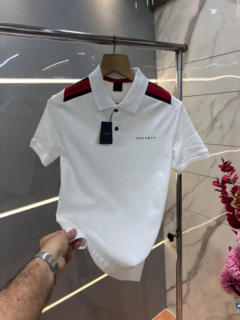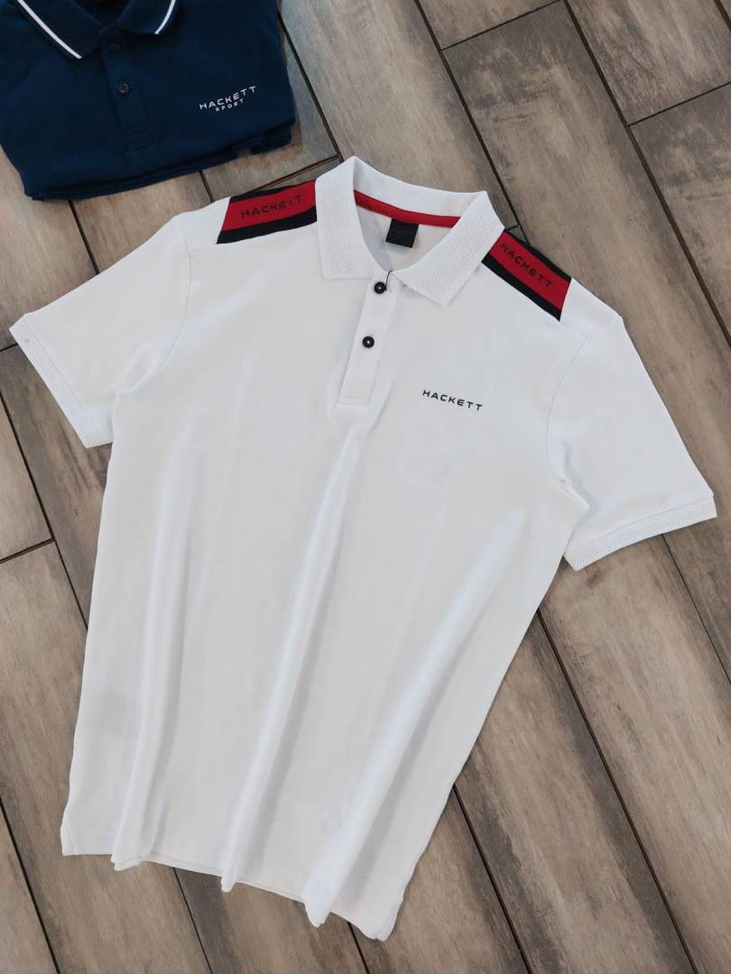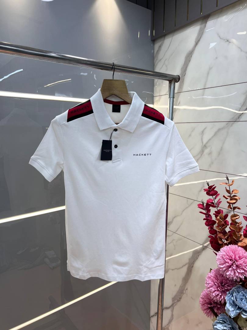 Hacke t White Premium 240 gsm interlock compact cotton fabric Polo Tshirt with Shoulder Strip and Patch Logo 2991