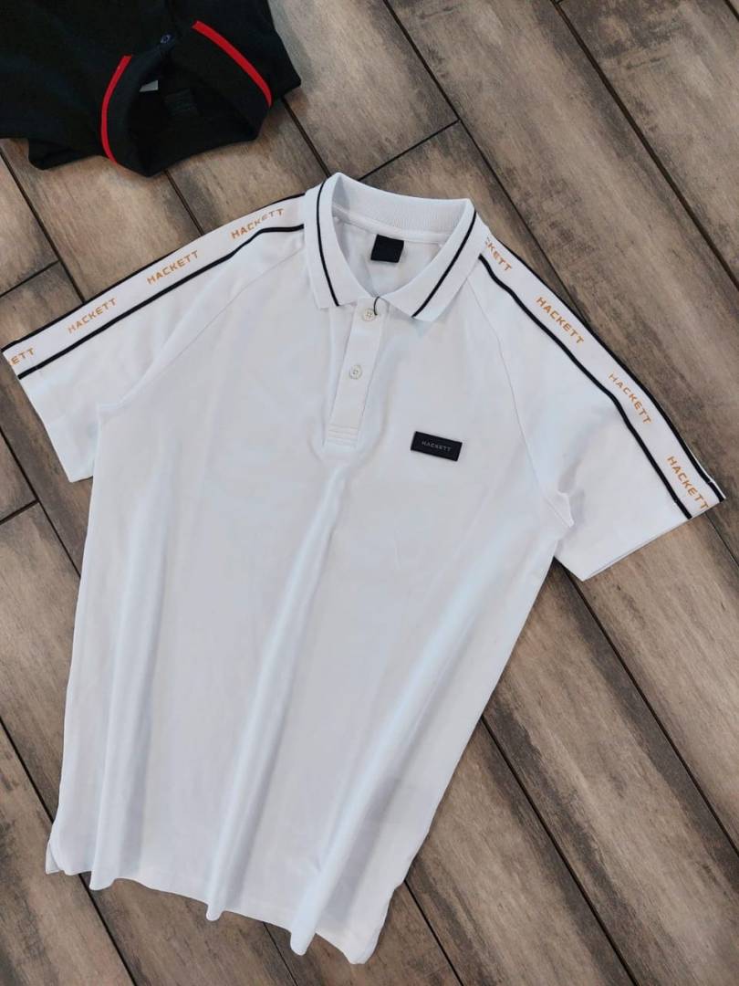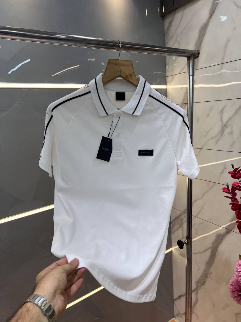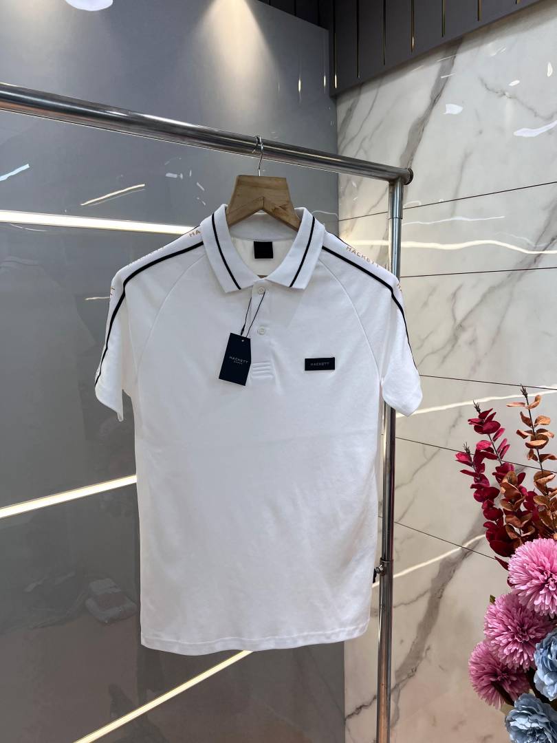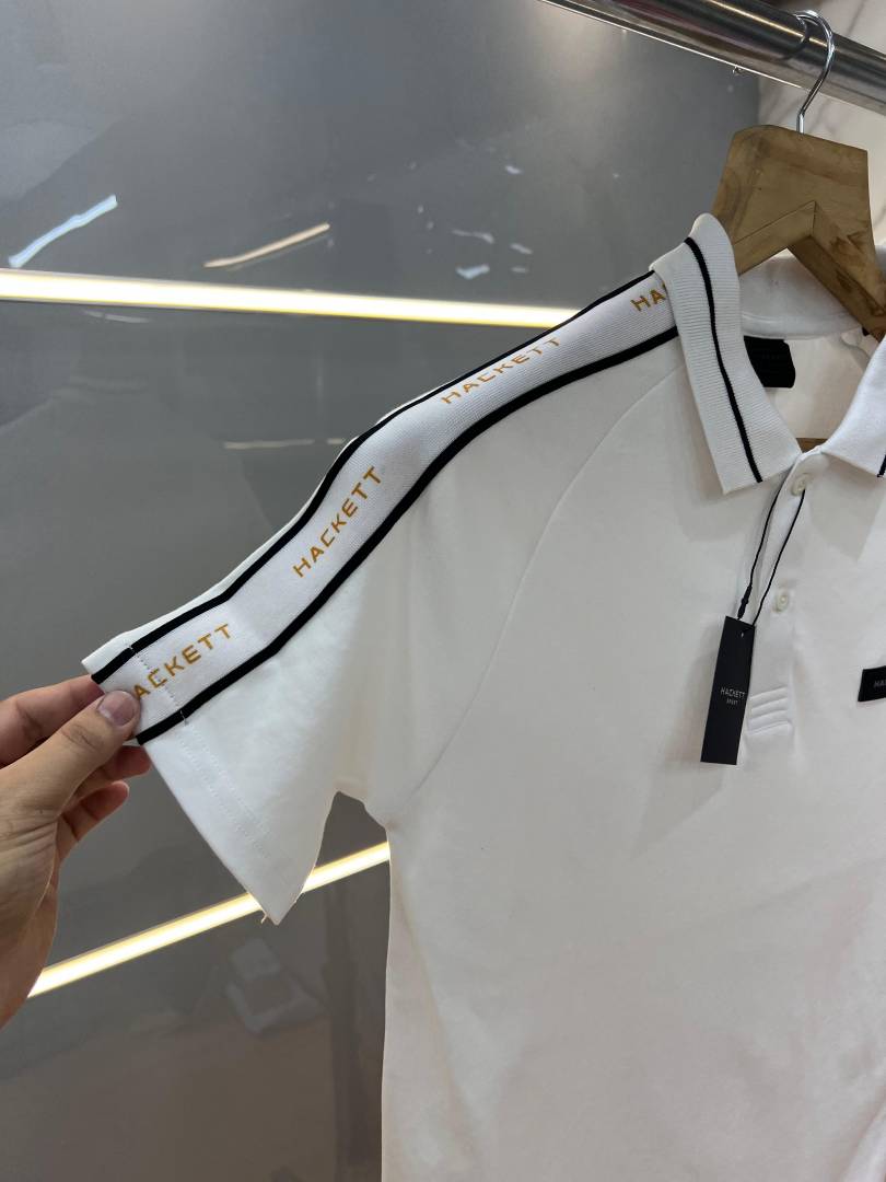 Hacke t White Premium 240 gsm interlock compact cotton fabric Polo Tshirt with Shoulder Strip and Patch Logo 2991