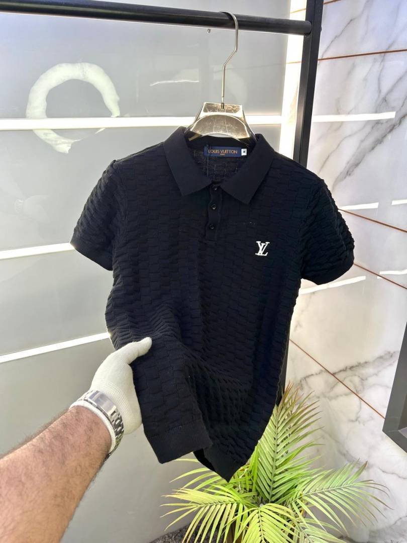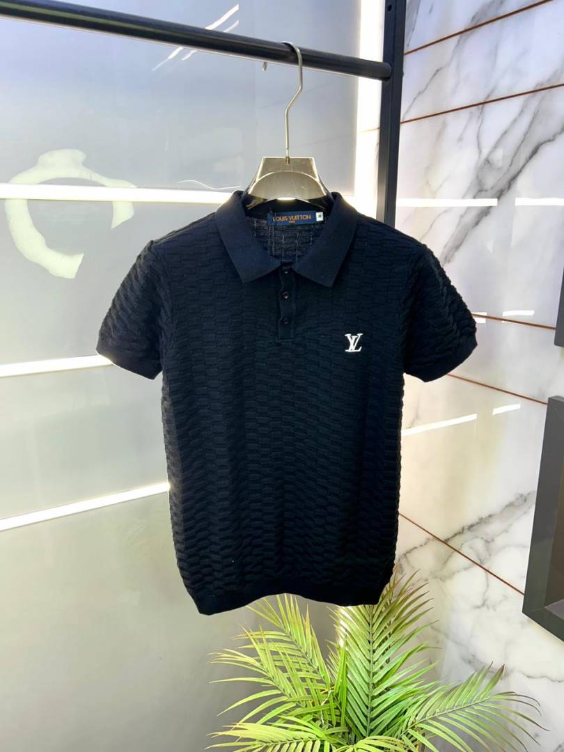 Louis_Vuitton Imported knitted Super Premium Black Collar Neck Polo T-shirt F3440-BL