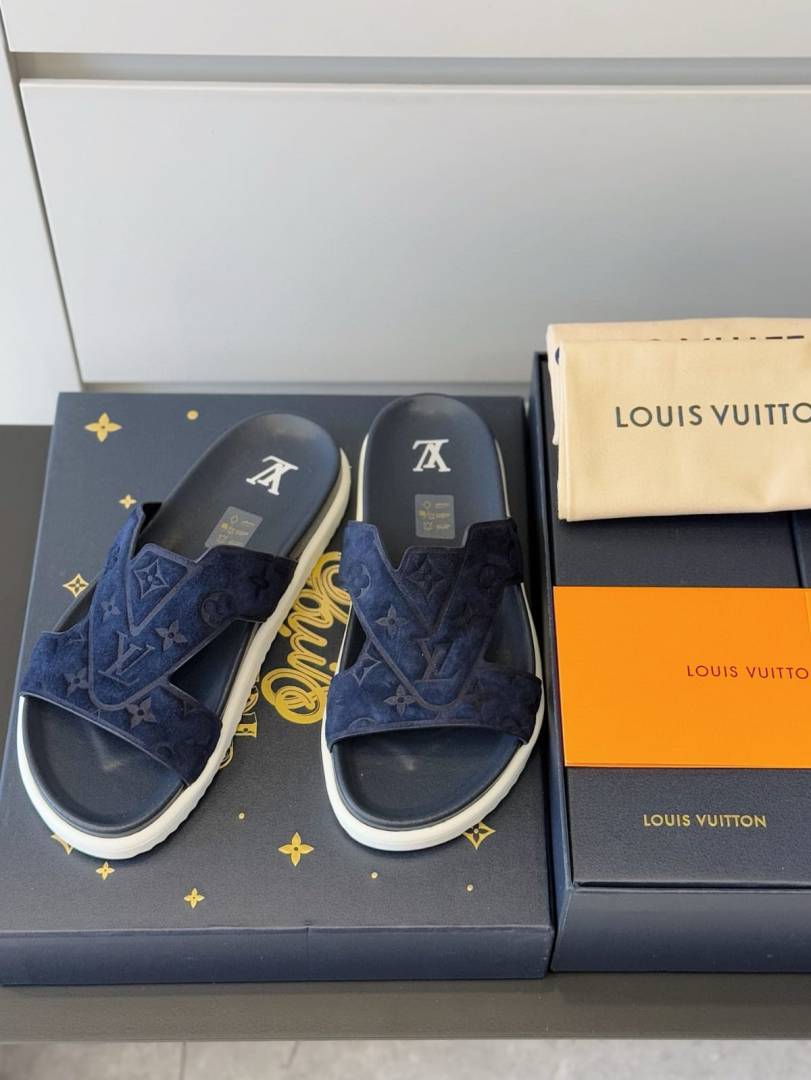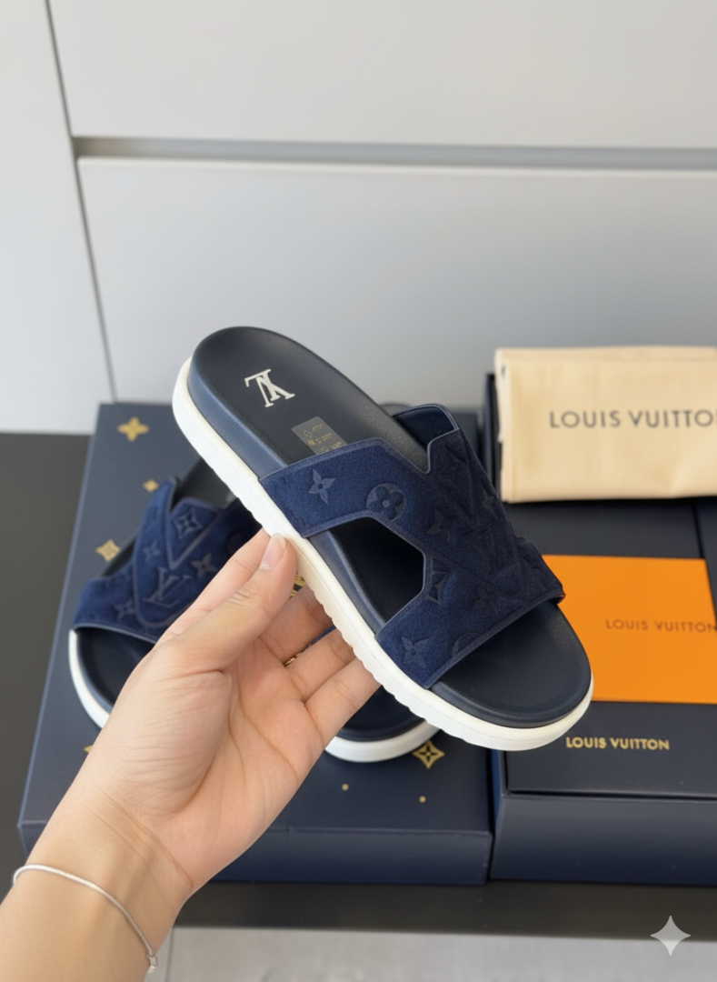 LouisVuitton Monogram Suede Riviera Flat Mules in Navy Blue.