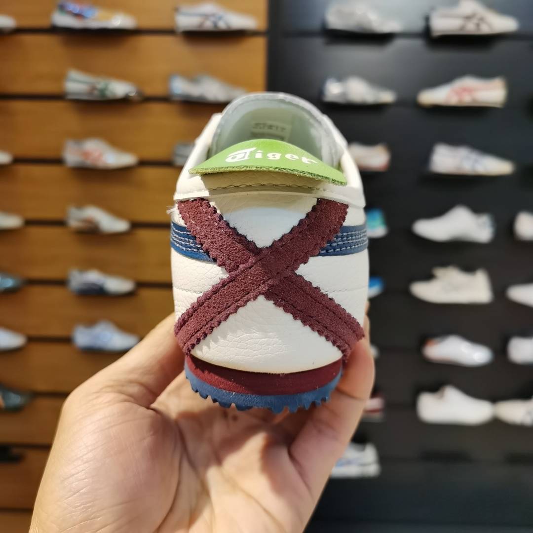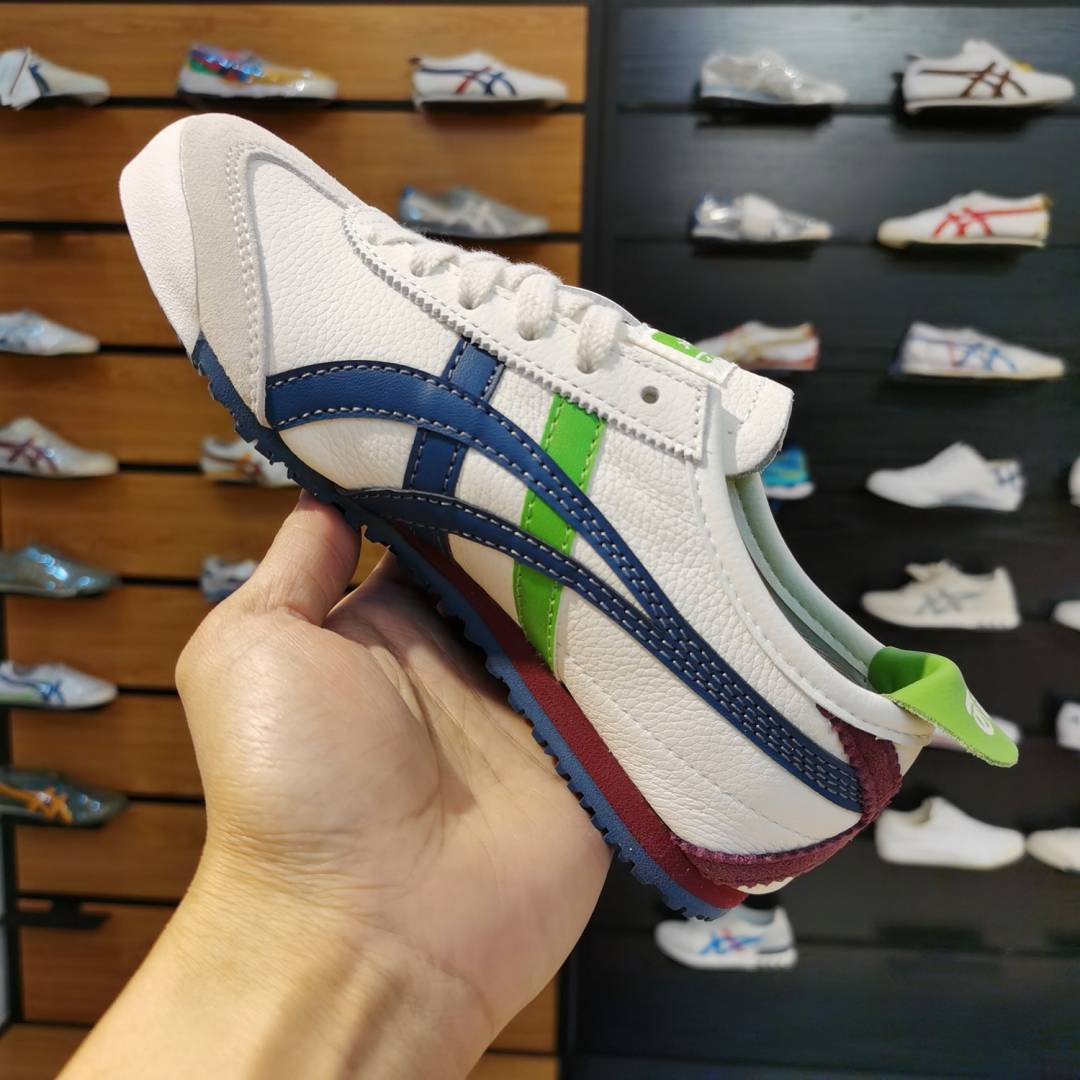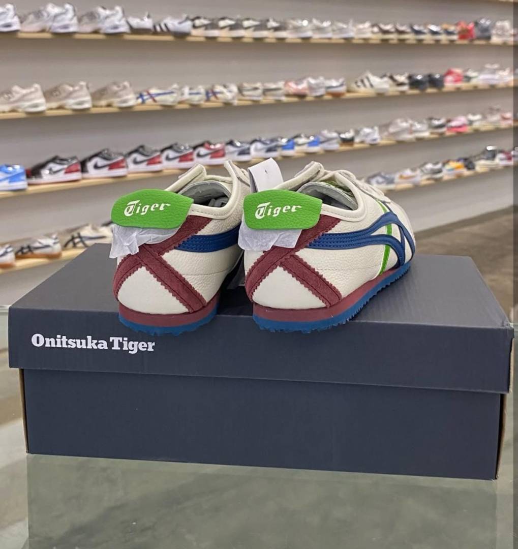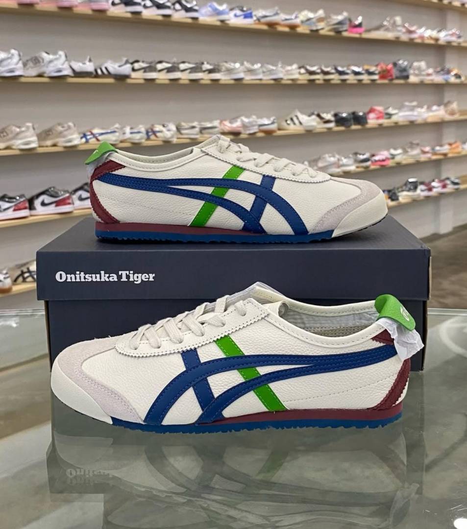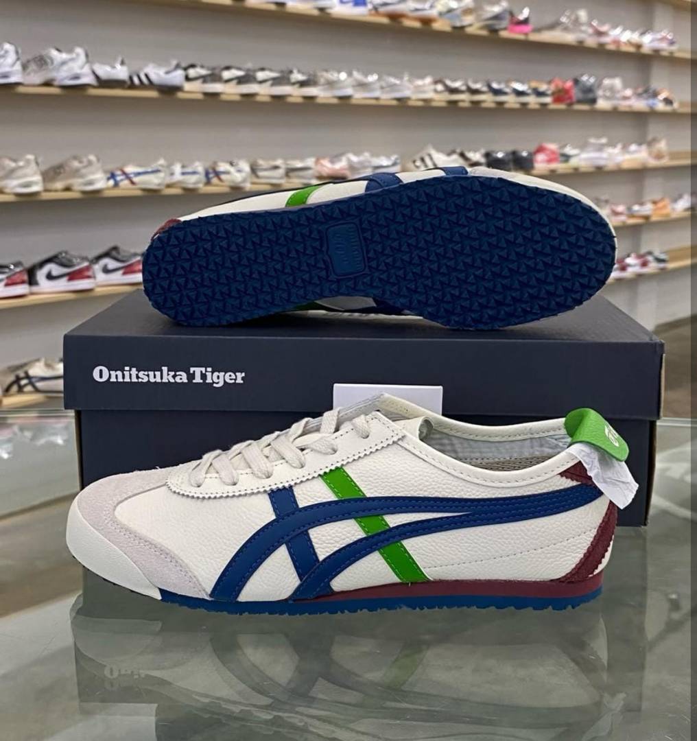The Onitsuka Tiger Mexico 66 "Cream/Mako Blue/Green" is a vibrant yet balanced colorway that stands out in the 2026 sneaker landscape. It features a soft "Cream" or "Birch" leather base, providing a neutral canvas for a dual-tone stripe setup: deep Mako Blue stripes intersected by a fresh Green (often Spruce or Kelly Green) accent. This 7A Premium Quality edition is a top choice for those who want a pop of color that still feels grounded in heritage track aesthetics.