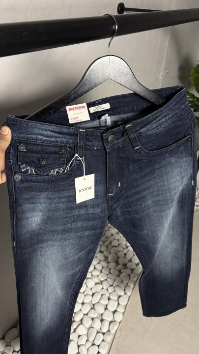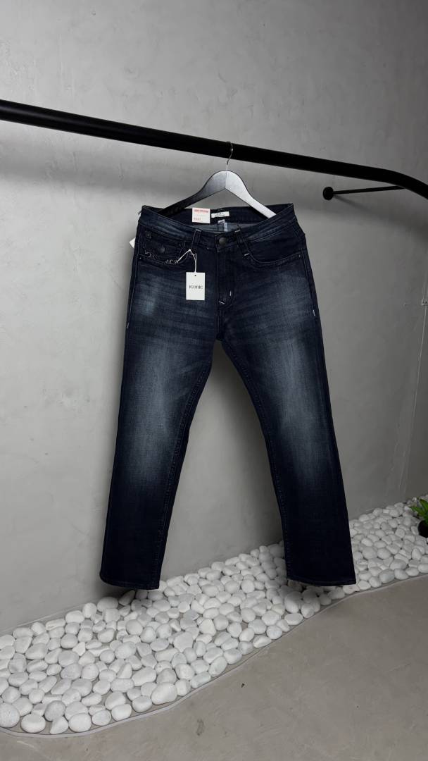 - Premium dark indigo denim with soft fade